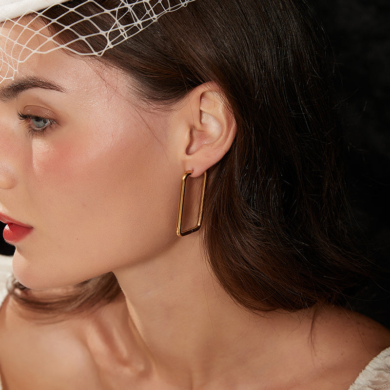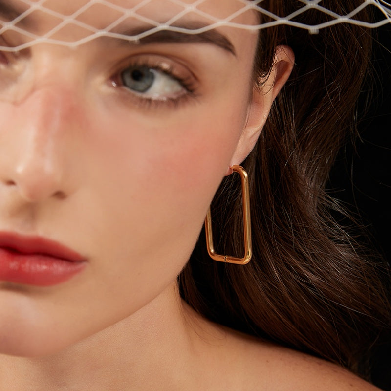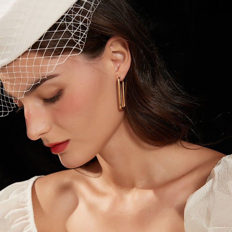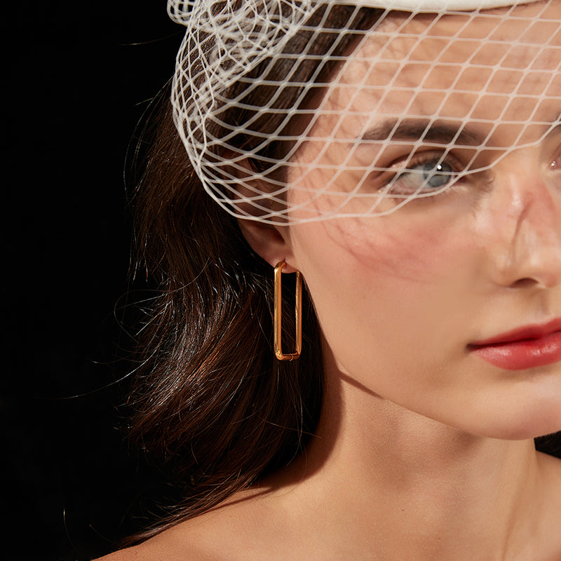 シンプルな幾何学的ラインが織りなすシンプルでありながら印象的なデザイン。力強さとエレガンスを併せ持つフォルムが、顔まわりに存在感と洗練された輝きを添えます。角度によって異なる光沢を放ち、どの瞬間も印象的に演出します。
