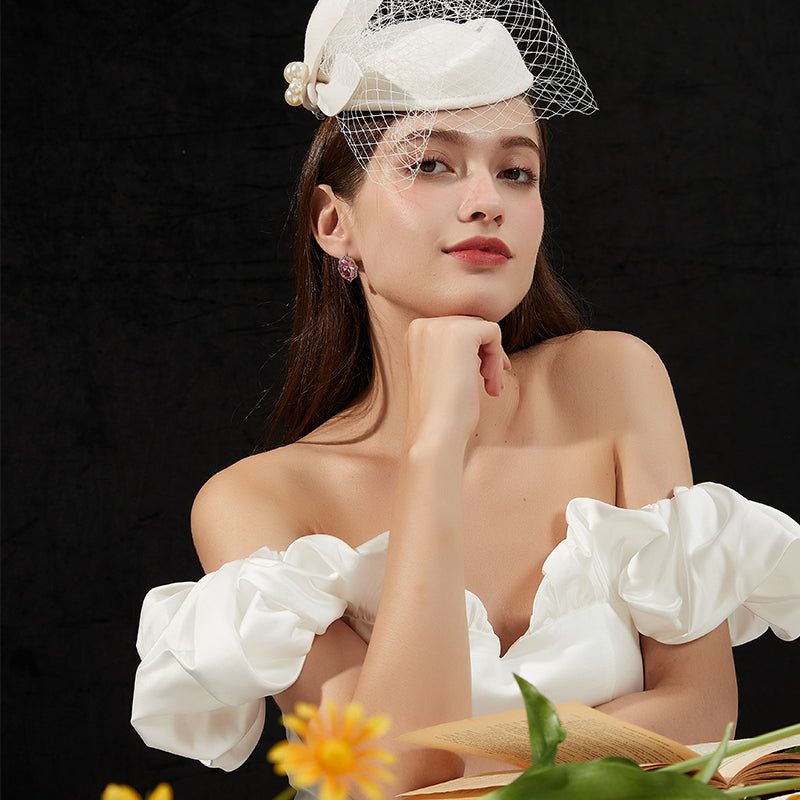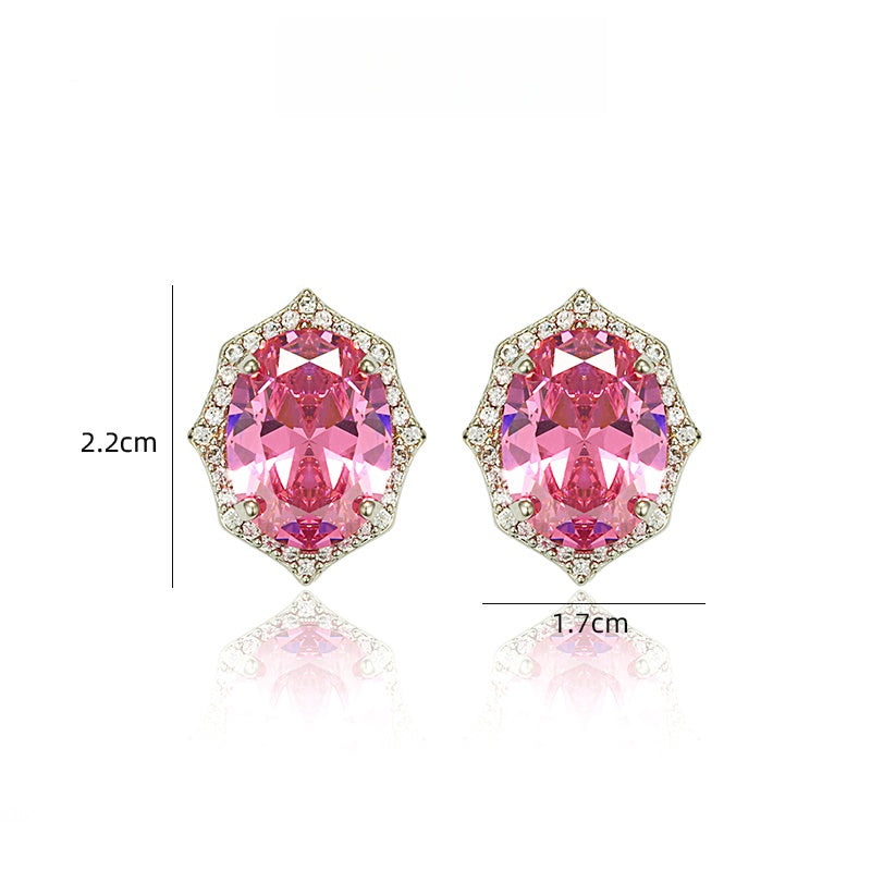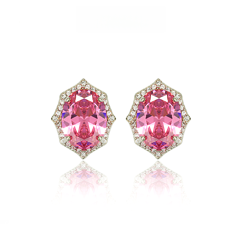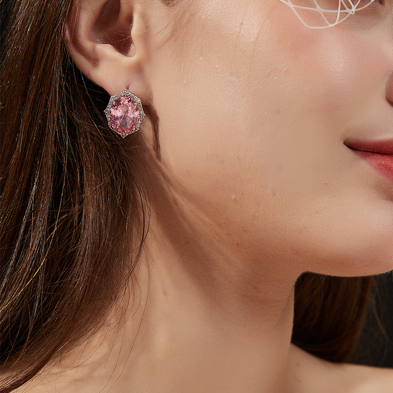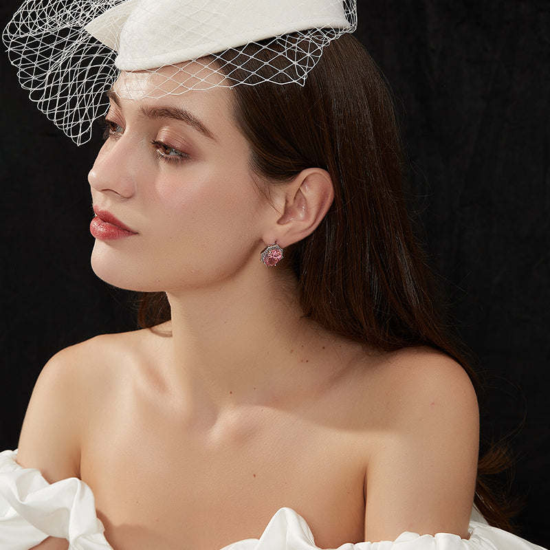 大きなピンクのジルコニアを中心に、輝く小さな宝石が取り巻くデザイン。華やかさと優雅さを併せ持つフォルムが、顔まわりに存在感と洗練された輝きを添える。角度によって異なる光沢を放ち、どの瞬間も印象的に演出します。