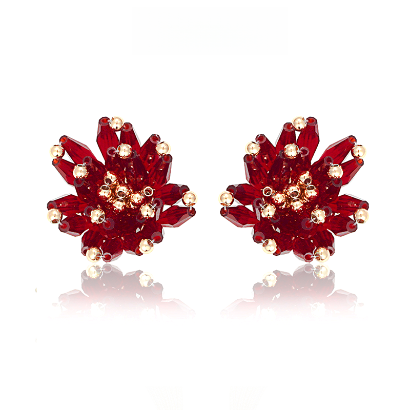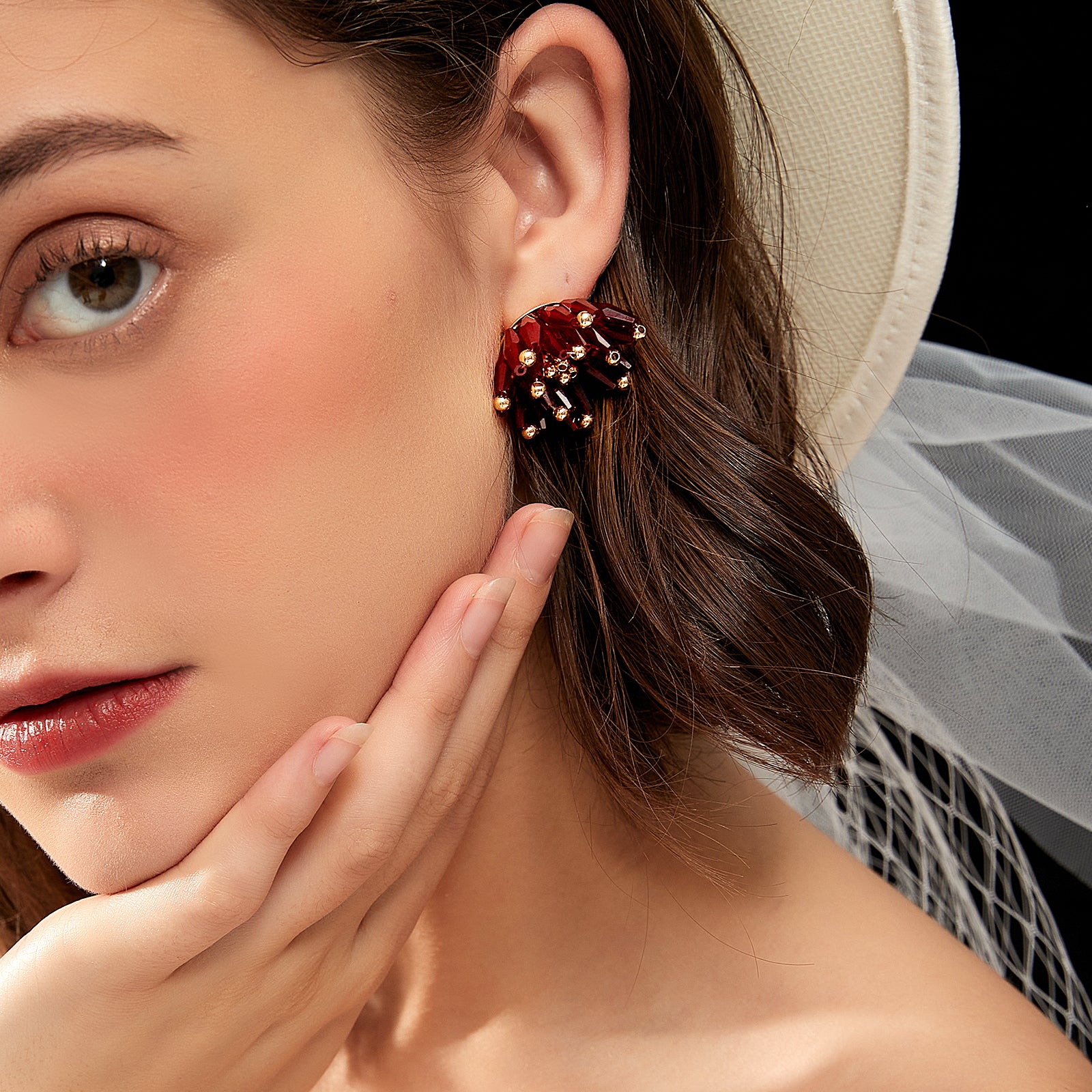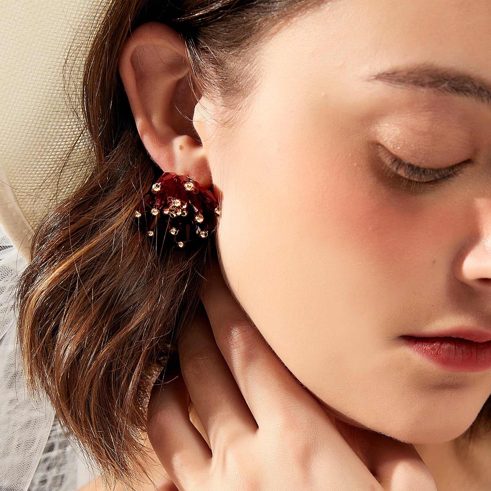 赤い瑠璃が花びらを模し、輝くメッキパーツが中心に集まるデザイン。華やかな色彩と立体的な造形が、顔まわりに存在感と洗練された輝きを添える。角度によって異なる光沢を放ち、どの瞬間も印象的に演出します。