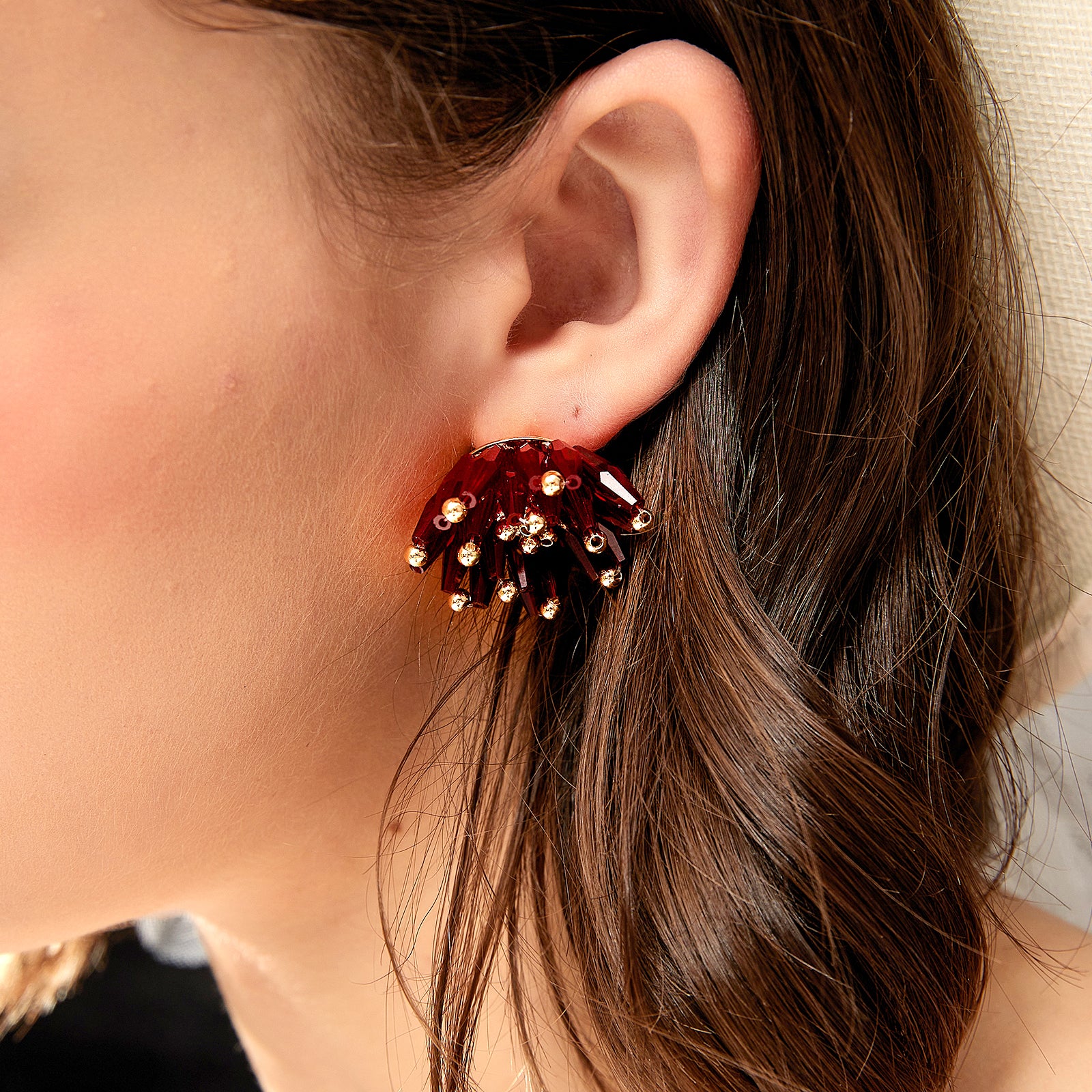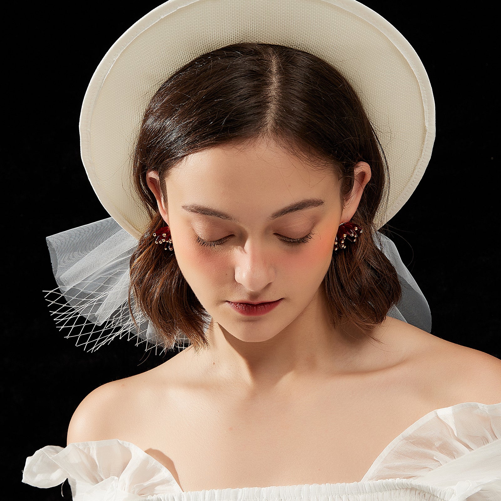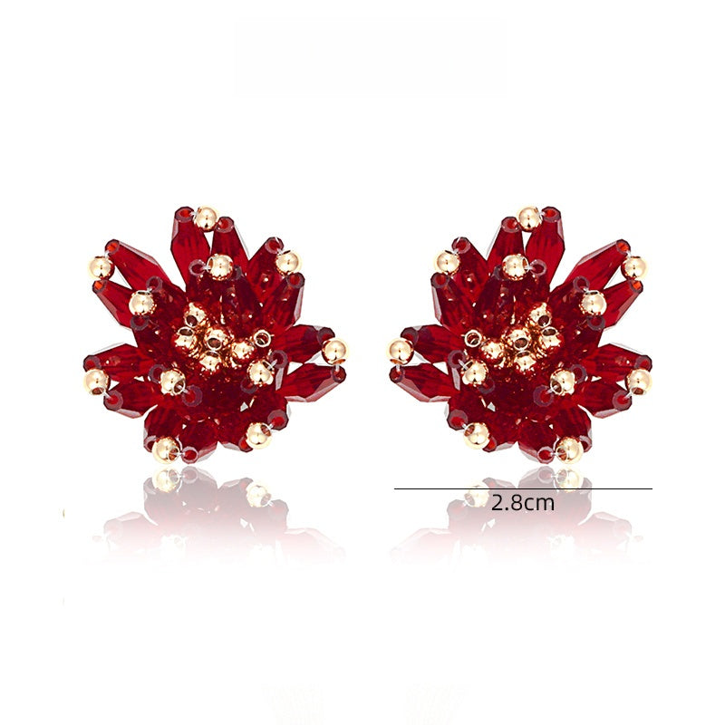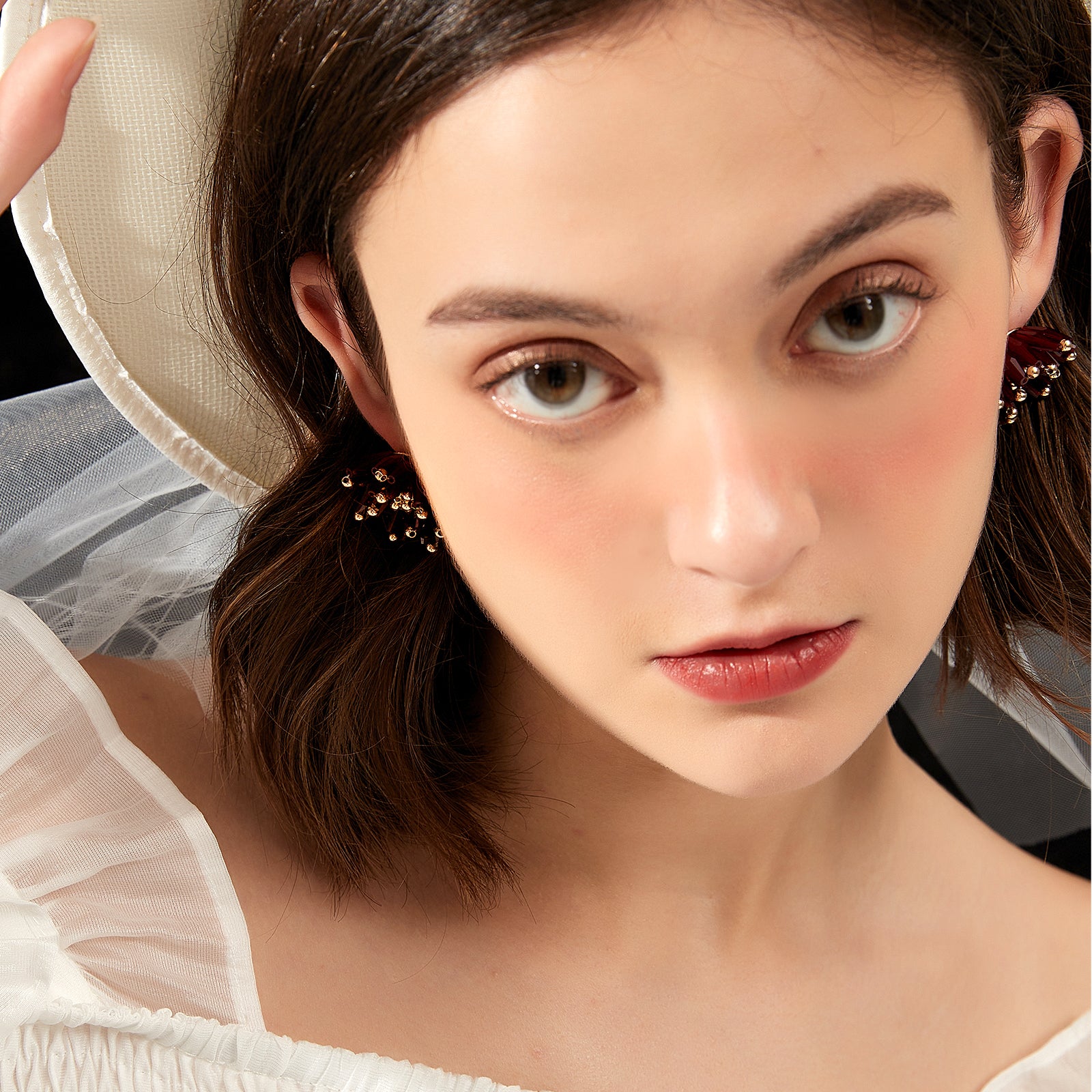 赤い瑠璃が花びらを模し、輝くメッキパーツが中心に集まるデザイン。華やかな色彩と立体的な造形が、顔まわりに存在感と洗練された輝きを添える。角度によって異なる光沢を放ち、どの瞬間も印象的に演出します。