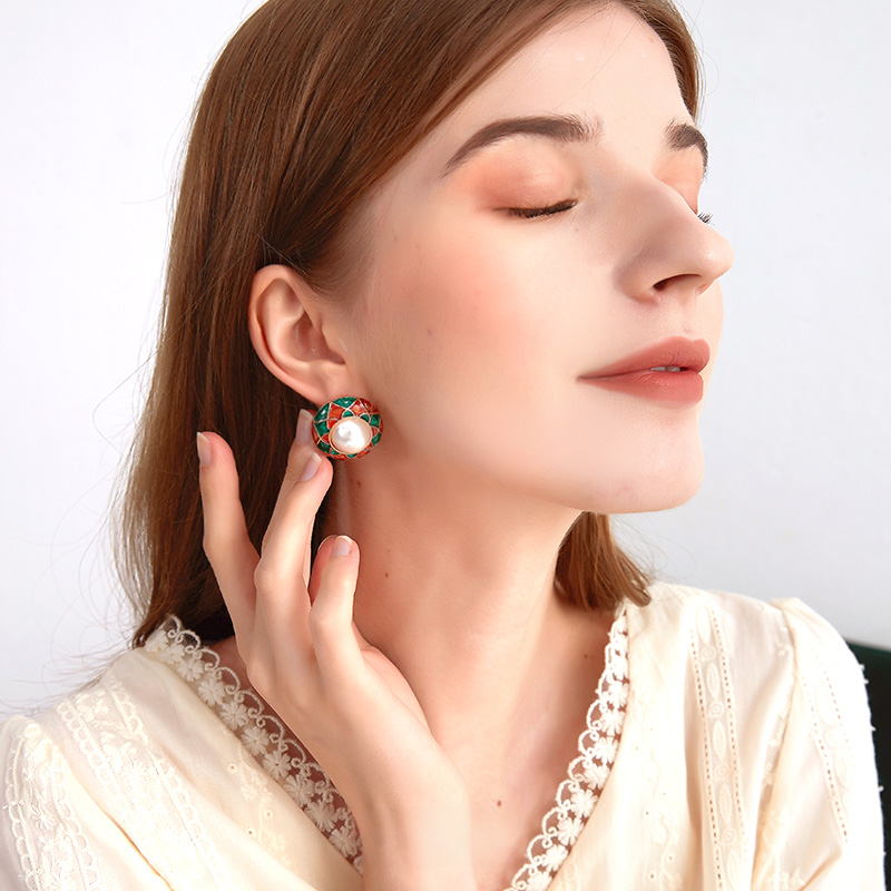 幾何学模様の彩釉が円環を彩り、真珠が中心で優美さを演出するデザイン。伝統の技法が生み出す色彩と輝きが、顔まわりに存在感と洗練されたアクセントを添える。角度によって異なる光沢を放ち、どの瞬間も印象的に演出します。
